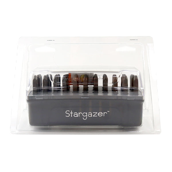 Fronto minuscolo "firma" set di timbro "Stargazer". La dimensione del carattere inciso è di circa 2 mm di altezza.