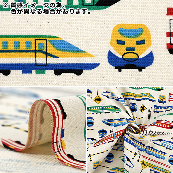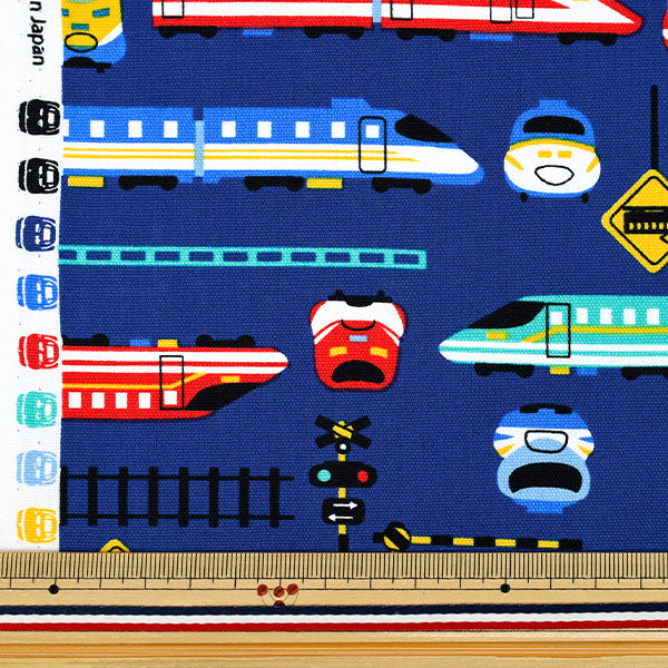 赤や青、緑などカラフルな新幹線風イラストと、線路や踏切、標識などデザインされたオックス生地!