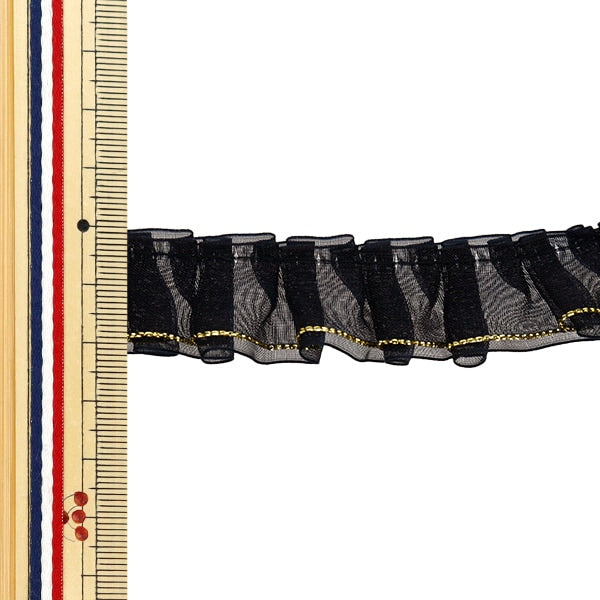 透け感のあるオーガンジーにラメのアクセントとタックを寄せた、ふわっとした風合いのダブルレースフリルリボンです。