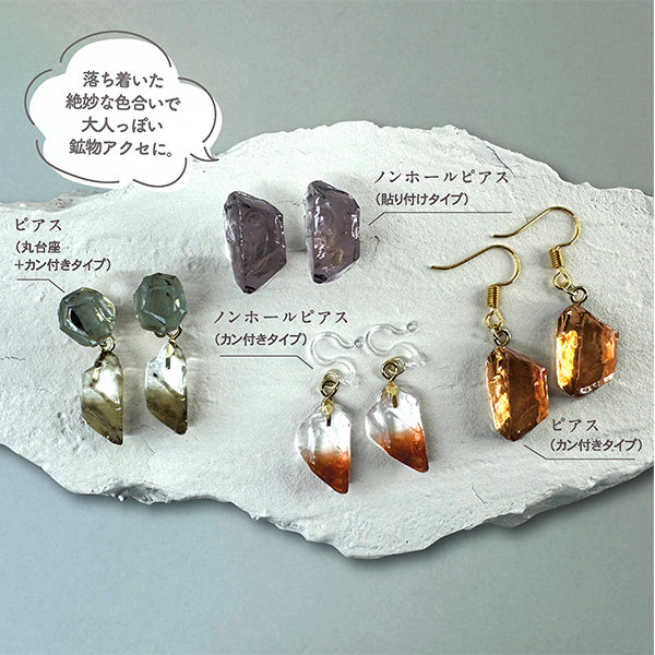 着色剤は枯葉、伽羅、夕暮れ、霜夜、寒空の5色入りで、落ち着いた絶妙な色合いで大人っぽい鉱物アクセが作れます。